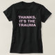 Otra publicación sarcástica de JessicaAmber - pregunta por las órdenes de los personalizados! Esta camiseta femenina muestra el texto "Gracias, es el trauma" en una audaz y moderna fuente rosa pastel con ligero efecto 3D, en un fondo negro. ¡Puedes cambiar el texto! Es una respuesta fácil dar un cumplido indeseado e insensible a cualquiera que dé un halago, como que se haga más delgado por no comer o por estar muy callado. Escrito con un tenebroso sentido del humor general Z. Creado el 1 de abril de 2023. ☀ Para más productos de humor sobre la salud mental, visita mi tienda de Zazzle: https://www.zazzle.com/store/jessicaamberartist ☀ Para pedidos de personalizados, envíame un correo electrónico a jessicaamberartist+custom@gmail.com