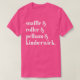 El color es muy bonito al natural, como la foto. El tejido es suave y de buena calidad. Sin defectos en el tintado, ni hilos sueltos o descosidos. Bien la impresión. Los bordes de las letras y el dibujo son nítidos, y el color contrasta muy bien con el de la camiseta.