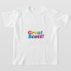 Este diseño de camisetas incluye la icónica frase "¡Gran Scott!" en un tipo de letra divertido, multicolor y ligeramente retro. Las letras son audaces y pop con un arcoiris vibrante de colores, lo que le da al diseño un toque lúdico y llamativo. El texto es el foco central del diseño, celebrando la famosa cita de la película con un estilo sencillo pero dinámico