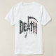 Embrace the darkness with this bold, striking "DEATH" text design. Perfect for fans of heavy metal music, gothic aesthetics, horror, or tattoo culture. The design features the word "DEATH" spelled out with a skeleton holding a grim reaper's scythe, dripping skull-like candles forming the 'T' and 'H', and a moss-covered stone arch for the 'D'. It's a fantastic, unique piece of dark art that makes an unforgettable statement on apparel, accessories, or home decor. Great for Halloween or year-round macabre style.