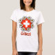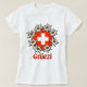 Edelweiss estilizados rodean una bandera suiza con el acogedor saludo suizo que hay debajo.