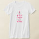 Esta camisa exhibe el texto "GUARDA CALMA Y COME LA TORTA" en fuente rosada. Sobre el texto es una torta tres-con gradas rosada. La torta tiene cintas negras entre las capas, dos corazones rosados en el top, y se está sentando en un soporte de plata de la torta.