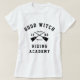 El diseño de las camisetas de Halloween incluye "Academia de la Buena Bruja, 1692, Salem, Misa" con letras de colegios negros, con dos escobas cruzadas.