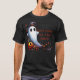 A cute, slightly anxious ghost wearing a witch's hat floats next to a carved jack-o'-lantern. The ghost is delivering a funny warning in orange text: "Don't scare me. I pee easily!" It's a humorous and charming graphic perfect for Halloween.