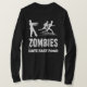 Este diseño de Halloween presenta un gráfico de un amenazante zombi que lanza hacia adelante, con los brazos extendidos. Se representan dos trotadores masculinos a mitad de la zancada, uno mirando hacia atrás a la criatura que se acerca. La escena captura una vibración de persecución emocionante. Debajo del gráfico, el eslogan "Zombies odian la comida rápida" está estampado en una fuente festiva, de sangre goteante, agregando un toque lúdico pero macabro al diseño. El ingenioso eslogan entrega un juego de palabras inteligente, lo que provoca risas y conversaciones entre los asistentes a la fiesta de Halloween.