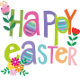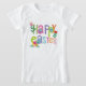 A bright and cheerful Easter design bursts across the front of this white T‑shirt, featuring the phrase “HAPPY EASTER” in playful, multicolored letters. Each letter is decorated like a festive Easter egg—striped, dotted, patterned—creating a lively, celebratory look. Surrounding the text are charming spring florals and leafy accents in pink, green, purple, orange, and yellow, adding a fresh seasonal touch. The overall feel is joyful, modern, and perfect for welcoming spring.
