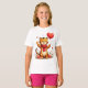 This is a t-shirt for a girl. It has an illustration of a happy tiger holding a heart balloon. It's surrounded by flowers and birds.