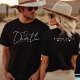 Elegante camiseta de pareja recién casada en blanco y negro con el texto Hasta que la muerte nos separe. Personalízala con los detalles de tu boda. Ideal para la luna de miel.
