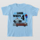 Un crucero de la policía, un motor de bomberos, globos y un texto que dice "Mira quién tiene 4" aparece en el diseño de nuestros héroes cotidianos para el cuarto cumpleaños.