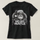 Ilustracion monocromo de Santa Claus como estrella de rock rebelde, con una chaqueta de cuero tachonado y gafas de sol, con la frase en negritas "HO HO HUSTLE" destacada en letras de alto contraste,