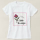 Camiseta con un marco cuadrado y un borde rosado, dentro dice "Hola Bella" escrito en un tipo de letra a la moda con una pequeña línea sacudida encima del texto. También una flor de tallo rosa y larga con hojas verdes en un lado. El diseño floral, cuidado y de bonito.