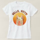 Diseño de gatos con las palabras "¡Hola Kitty!" Un gato riéndose con sol retro en el fondo.