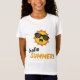 Un ilustracion de un lindo y divertido sol feliz kawaii con gafas de sol negras y cita de "Hola verano". La temporada de verano es siempre una de las mejores vacaciones y vacaciones del año. ¿Cómo te hace feliz el color amarillo y naranja?
