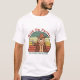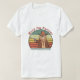 "Hold On Partner, I’m overstimulated." design shows a cartoon beaver dressed as a cowboy, holding a revolver. The beaver stands in front of a circular retro groovy background with horizontal stripes in red, yellow, and green. The text above the beaver reads, "Hold On Partner," and below it says, "I'M OVERSTIMULATED."