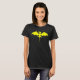 Vuelo amarillo del pterodactyl con las alas separadas a ser una parodia del super héroe en una camiseta negra.