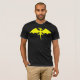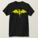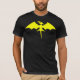 Vuelo amarillo del pterodactyl con las alas separadas a ser una parodia del super héroe en una camiseta negra. Olvide los palos, si podría crear a un nuevo superhéroe que sería hombre del Pterodactyl.