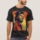 Un audaz ilustracion inspirado en los años 70 que representa una figura con una expresión determinada, con una chaqueta de estilo militar y una boina adornada con estrellas. La cálida y vibrante paleta de rojos, amarillos y naranjas evoca una sensación de pasión y rebelión, mientras que el paisaje tropical con montañas y palmeras en el fondo añade un toque cinematográfico. El diseño de estilo poster y alto contraste recuerda a la iconografía revolucionaria clásica de la época