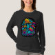 Arte neón colorido con hongos azules y rosas y flores y fondo negro.