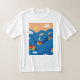 The illustration shows large blue waves, an orange sky with smiling clouds and yellow crescents.