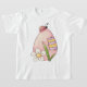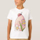 Una chica bicho encima de un huevo de Pascua decorado. Este diseño se ve realmente efectivo en esta camiseta para niños