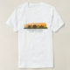 La elegante camiseta cuenta con la playa de Huntington, la silueta de la ciudad de CA con coordenadas de latitud y longitud y un lavado de color acuático con puesta de sol naranja sobre fondo amarillo.