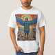 A.I. impresión asistida de una figura alada discípula del mítico antiguo Ícaro griego, con plumas azules flotando sobre un paisaje de ciudad colorido, rodeado por un sol radiante y cielos giratorios.