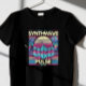 diseño de camisetas de estilo vintage con puesta de sol retro con rayos solares en capas, palmeras y una silueta de playa, junto con la frase "pulso de onda sintética" 🌅 🌴 ✨