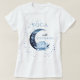 Una elegante camiseta de negocios de yoga con una flor azul de loto en una luna creciente decorada con luces azules de aguijón. Anuncie su negocio con esta elegante camiseta de yoga. Ideal para que el instructor de yoga y los estudiantes se pongan en clase. También es ideal para el bienestar y la sala de masajes/Personalizar de salón con su propio nombre de negocios.
