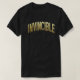 Un diseño oscuro y misterioso que presenta la palabra "invencible" en un tipo de letra gótico, dorado, con un fondo texturado, industrial.