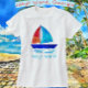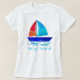 Un velero de color bonito vela por el azul del océano. Una vela tiene los colores de la puesta de sol y la otra tiene una amplia gama de bonitos azules oceánicos. El casco del barco es un azul zafiro rico. Las olas del océano son acuáticas. Las palabras Isla Jekyll están debajo del barco. Celebra la maravillosa costa de Georgia con esta divertida camisa de vacaciones.