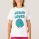 Esta camiseta del chica tiene una mano azul con un dedo señalador más un contorno de la sombra roja que muestra las palabras "Jesús ama" en una letra impresa en negrita con un contorno de sombras coincidentes en el tema de la cita basada en la fe. Esta camiseta presenta un ajuste relajado para la forma hembra hecha de 100% algodón esta camisa es duradera y suave que hacen una gran combinación.