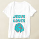 Esta camiseta de cuello v de mujer tiene una mano azul con un dedo señalador más un contorno de sombra roja que muestra las palabras "Jesús ama" en un letra negrita con un contorno de sombra coincidente en el tema de la cita basada en la fe. Esta teta es de color y costura para una mujer hecha con tela ligera para mayor comodidad.