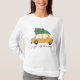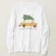 Este diseño muestra un auto amarillo que lleva un árbol de Navidad atado a su techo, rodeado de copos de nieve cayendo. El coche tiene manchas de nieve sobre él, lo que añade a la acogedora atmósfera de invierno. Debajo del auto, la frase "jingle todo el camino" está escrita a mano y juguetona.