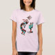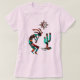 ¡Esta es una camiseta única de mujeres de Kokopelli "una especie"! El Kokopelli del Suroeste, de color turquesa, Naranja y negro, toca la flauta y baila alrededor de un cactus bajo el sol.