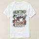 Esta camiseta blanca presenta un diseño que celebra las actividades al aire libre. El texto "CAZANDO SOLUCIONADO LA MAYORÍA DEL PROBLEMA" está en la parte superior, con el ilustracion de un rifle y un ciervo. Debajo, "PESCA RESOLUCIONA EL RESTO" se muestra encima de un pez bajo que salta, lo que sugiere un amor tanto por la caza como por la pesca.