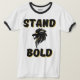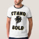 Esta camiseta con forma de jengibre tiene un diseño que muestra las palabras "Stand Bold" en un tipo de letra negrita con letra negra sobre una sombra de color dorado con un icono de cabeza de león negro y dorado en el centro en este tema de cita de biblias basado en la fe. Este tee tiene un aspecto de inspiración vintage con esposas contrastantes y un escote para un ambiente deportivo pero informal.