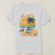 Aquí hay una camisa alegre y colorida sobre la playa que te llevará durante los meses de verano. La imagen tiene una furgoneta de estilo retro que está aparcada bajo una palmera, y un surfista que camina a su lado. El fondo es un cielo naranja brillante con olas blancas en un océano azul. El texto del naranja dice "Encuéntrame bajo las palmas". Los colores predominantes son verde verde azulado oscuro, azul ceruleño, naranja y amarillo, y la mayoría de los colores son muy agradables.