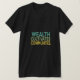 El diseño de la camiseta muestra el texto "La riqueza cultiva a las comunidades" en una letra negrita y sans-serif. Las letras están dispuestas en forma apilada, con cada letra en un color diferente. Los colores utilizados son luminosos y vibrantes y el diseño general es llamativo y moderno.