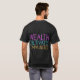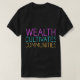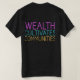 El diseño de la camiseta presenta un patrón vibrante y geométrico con la frase "La riqueza cultiva comunidades" integrada en ella. Las formas y líneas superpuestas crean una composición dinámica y visualmente atractiva, mientras que el texto en negrita y multicolor agrega un contraste llamativo. El diseño transmite un mensaje de construcción de la comunidad y el impacto positivo de la prosperidad económica.