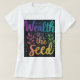 La camiseta presenta un diseño atrevido y llamativo con el texto "Wealth is the Seed" que se muestra de forma destacada en la parte delantera. El texto es un gradiente multicolor vibrante, con cada palabra una sombra diferente para representar las diversas maneras en que la riqueza puede crecer y florecer. El diseño general es sencillo pero impactante, lo que deja mucho espacio para que el mensaje brille.