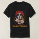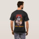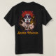 Un sorprendente ilustracion de Santa Muerte, retratado con una cara tradicional de cráneo de azúcar, coronado con rosas rojas, y sosteniendo un revólver dorado. Sus largos cabellos se enmarcan en la cara mientras sus manos tatuadas muestran gestos simbólicos, mezclando belleza, misticismo y poder