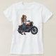 This is a digital illustration in a cartoon style featuring a young woman with long, wavy blonde hair tied in a high ponytail. She has fair skin and is wearing a brown jacket over a white tank top, blue jeans rolled up at the ankles, and brown lace-up shoes. She stands confidently beside a vintage orange and black motorcycle,.The background is plain beige, highlighting the character and motorcycle.The artwork has clean lines and vibrant colors, giving it a modern, dynamic feel.