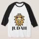Esta camiseta de manga de 3/4 tiene un diseño que presenta la palabra "Judah" en un audaz y único tipo de letra impresa con letras negras que muestran una imagen de estilo personalizado de la cabeza de un león con la corona del rey en el centro en este tema de citas basadas en la fe. Esta camisa tiene un cuerpo de color blanco o ceniza con mangas y collarín a juego con los picos de la parte inferior y de la manga de doble aguja para una larga duración.
