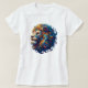 Cabeza de león con estampado giratorio con vibrantes tonos azules, naranjas y amarillos, que simbolizan fuerza y creatividad.