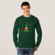 Leprechaun Clover Shamrock Patrick's Day camiseta de manga larga. Camiseta temática del Día de San Patricio que presenta el ilustracion de un hombre alegre. El hombre usa un gorra verde con una banda negra y una hebilla de oro y tiene una barba roja brillante. Su cara tiene una expresión amistosa con una sonrisa. Shamrock renuncia al hombre.