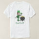 The leprechaun stands with a pot full of gold and wishes good luck.