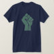 Un puño verde de palabras en el frente. "Libertad" en persa en la parte de atrás del hombro derecho.