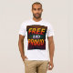 El diseño de la camiseta "Free and Proud" presenta un fondo vibrante y abstracto con patrones giratorios y líneas en negrita. Las palabras "Libre y Orgulloso" se exhiben de manera destacada en una variedad de colores brillantes y contrastantes, con tipografía detallada y letras nítidas y nítidas. El diseño es llamativo e impactante, transmitiendo un mensaje de libertad y autoexpresión.