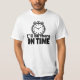 El diseño tiene una cita de mentiras "Estaré allí a tiempo". Se podría imaginar que esto se usaría en un ambiente humorístico, como en una camiseta, una taza o un poster. Este tipo de diseño juega con la experiencia universal de la gente que habitualmente llega tarde, haciéndolo relacionable y divertido.