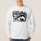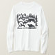 Escena de lobos en el bosque aullando en la luna. Un lobo grande se esconde parcialmente en el paisaje de fondo que tiene montañas y árboles. Todo el diseño se hace como una silueta de color negro con recortes en los que aparece el color de la camisa.
